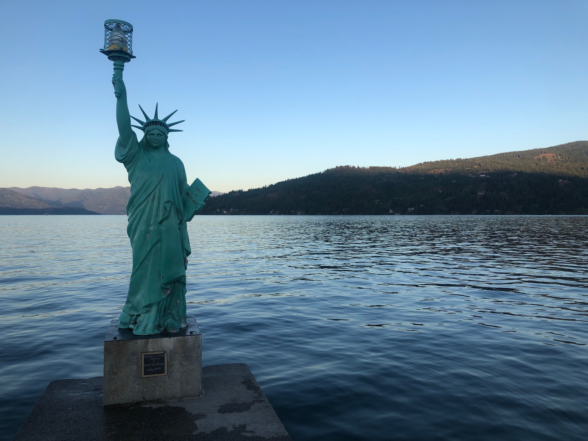 The upper left picture is a statue of David Thompson, a British-Canadian explorer who surveyed and mapped much of the Northwest in the late 1700’s and early 1800’s. Next to him is a 6ft tall replica of the Statue of Liberty that can be found along one of the trails following the lake.